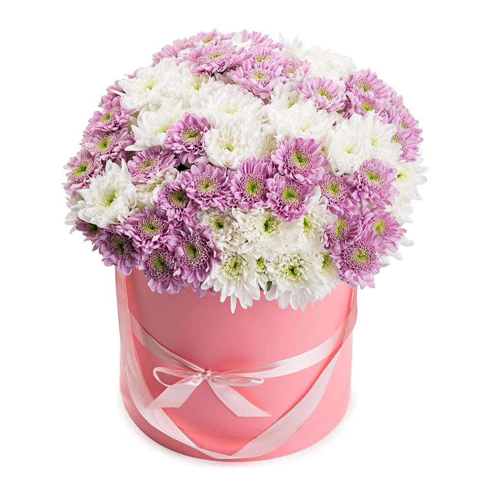 25 хризантем в шляпной коробке