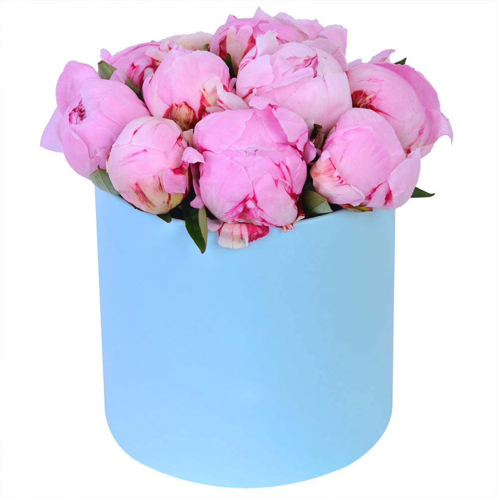 Букет из 11 розовых пионов в голубой шляпной коробке
