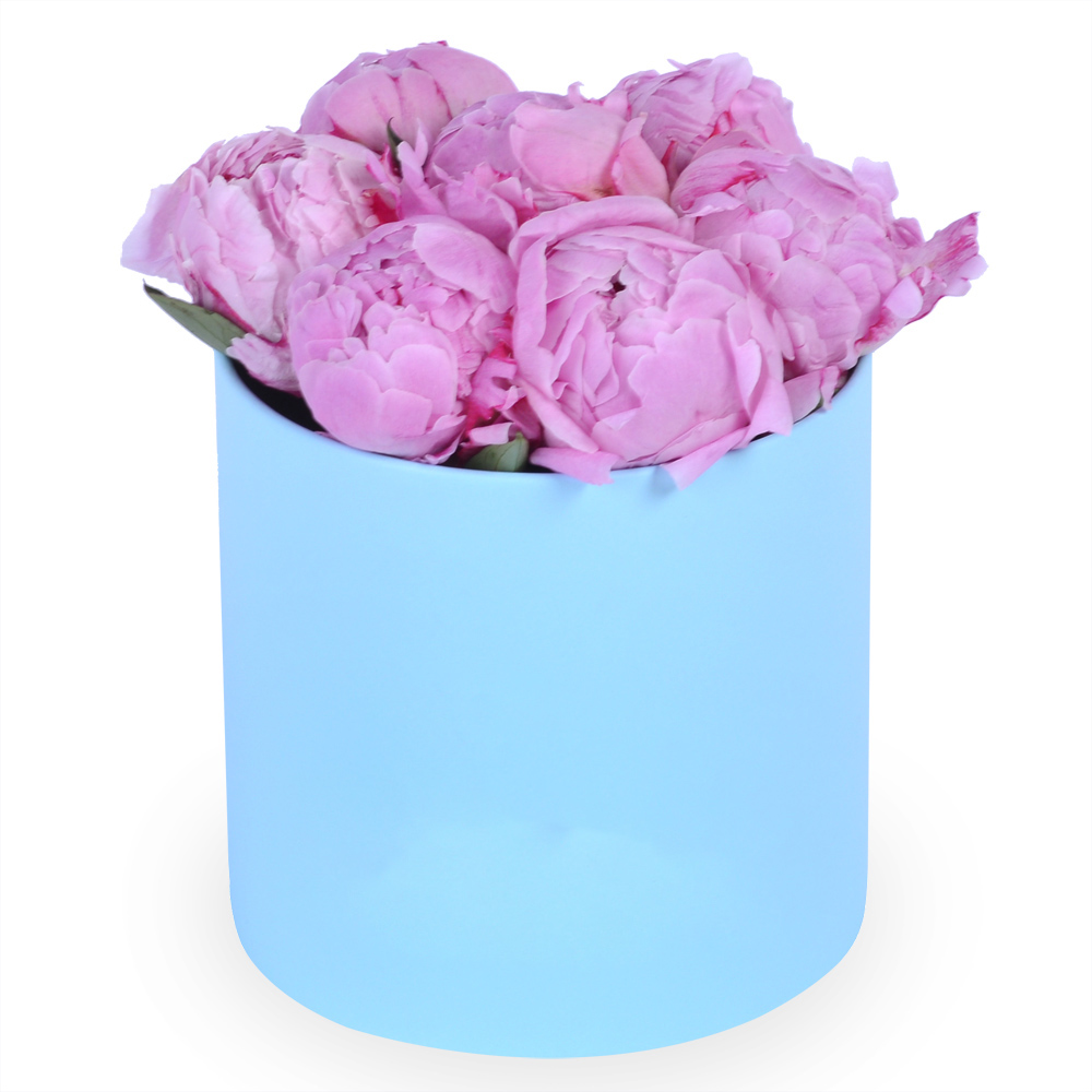 Букет из 7 розовых пионов в голубой шляпной коробке