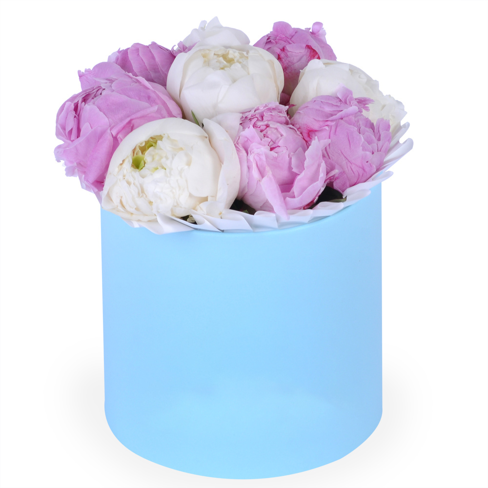 Букет из 9 разноцветных пионов в голубой шляпной коробке